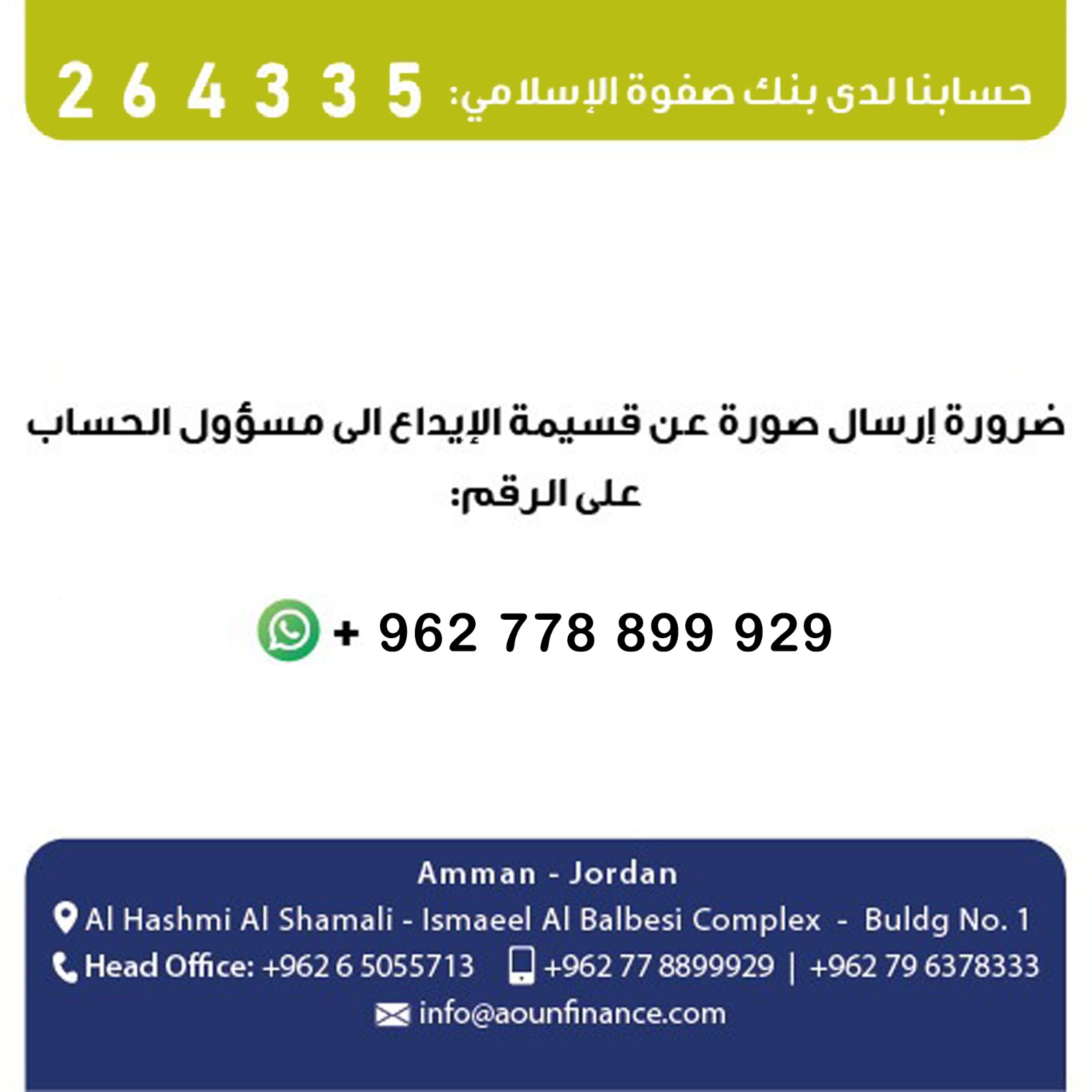 Aoun Finance Company LLC is registered on 1/25/2021 under the number (59051) and bears the national number of the establishment (200180445) and its address is Amman - Northern Hashmi. It was established with the investment of a Jordanian businessman.